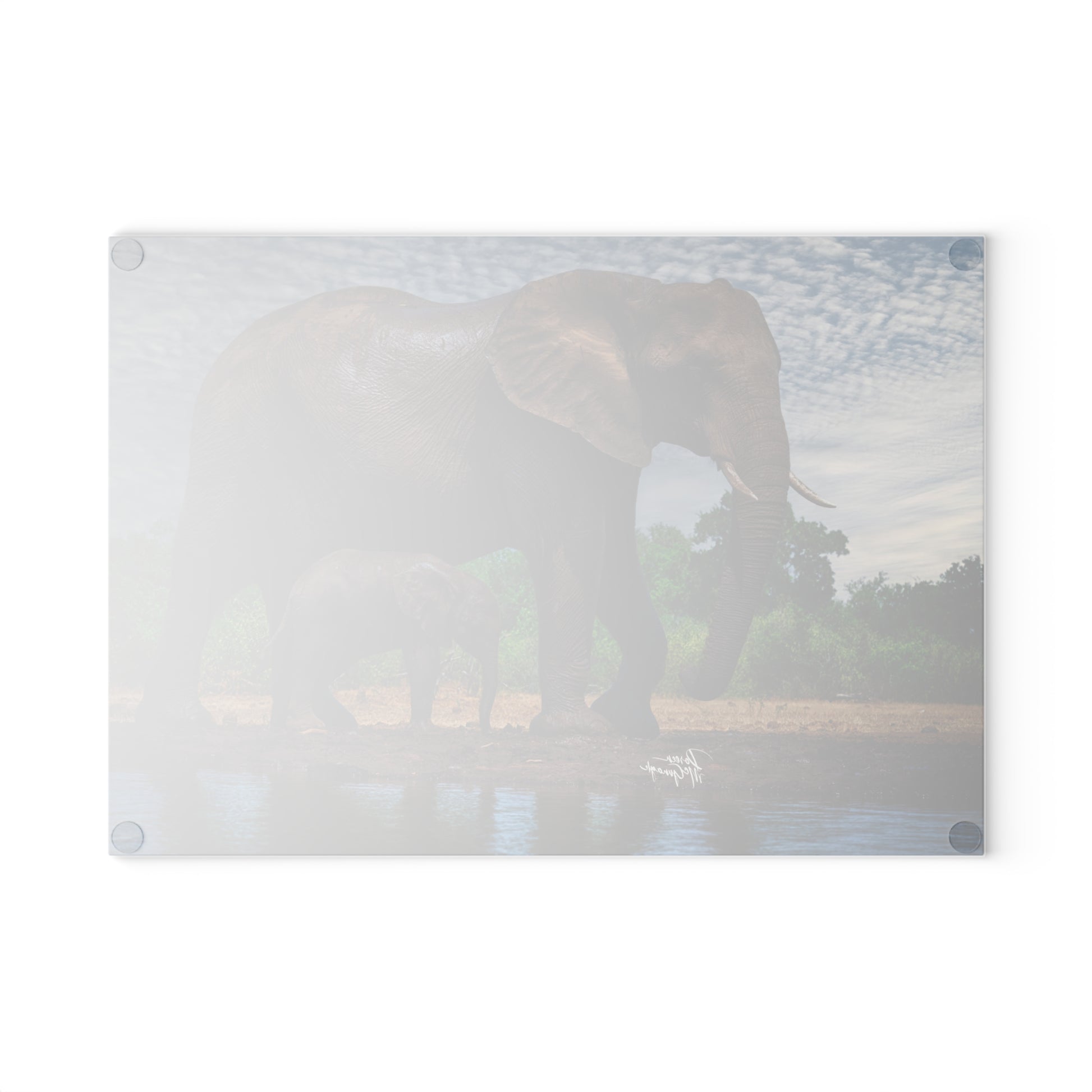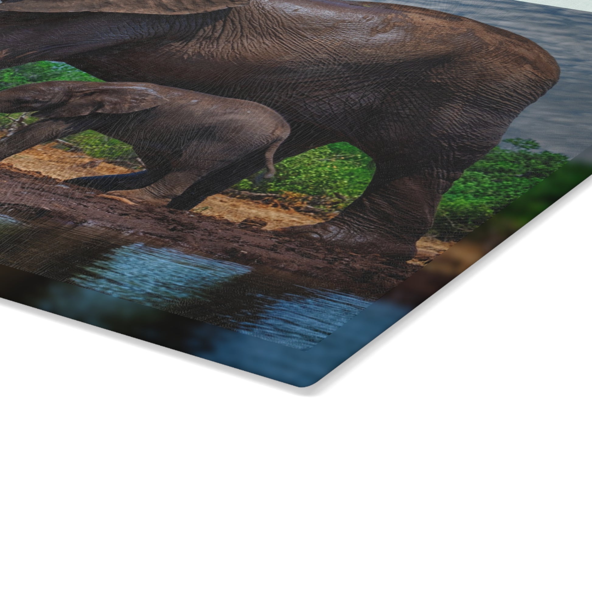 Enjoy Nature Glass Charcuterie Cutting Board with Elephant Baby Walking with Mom Design