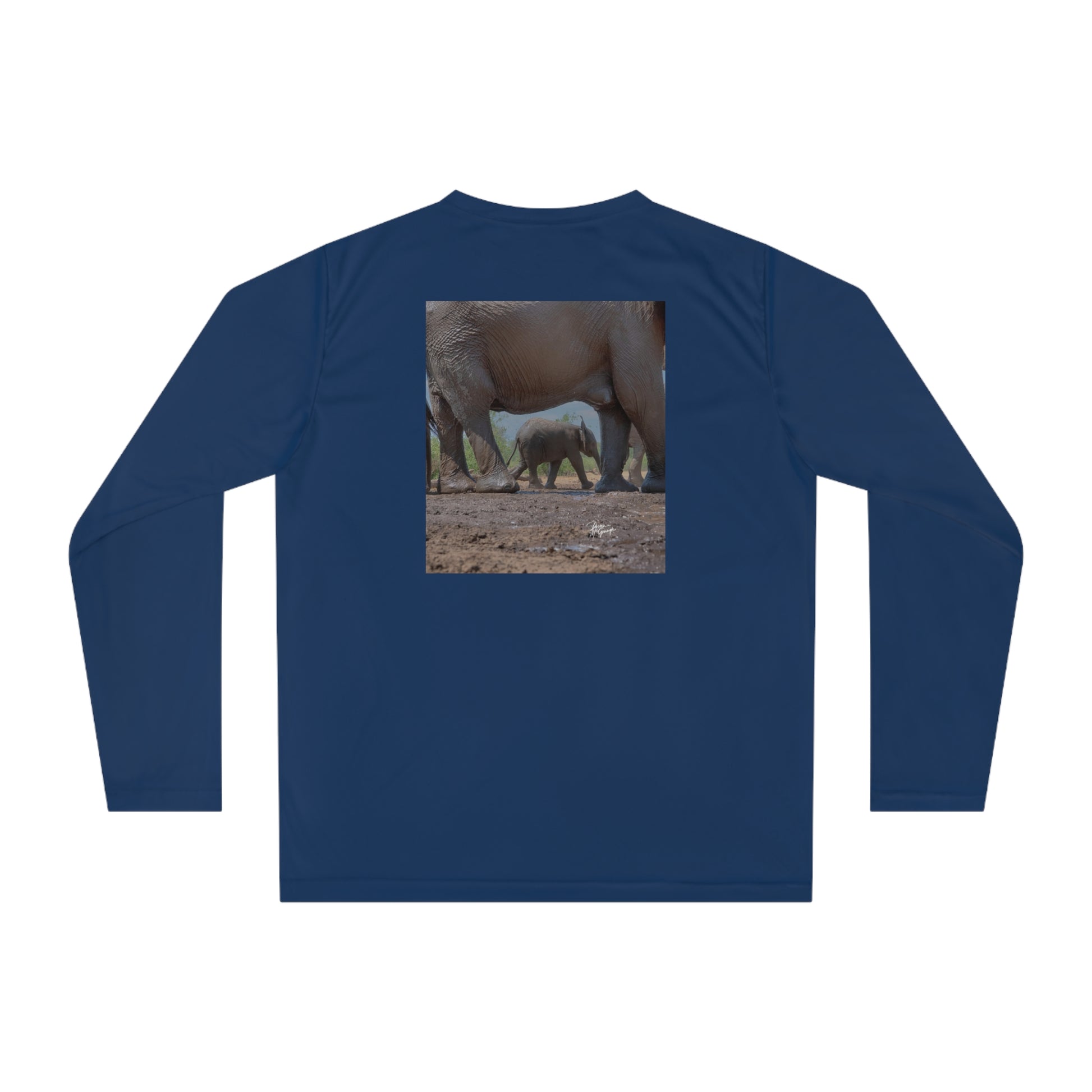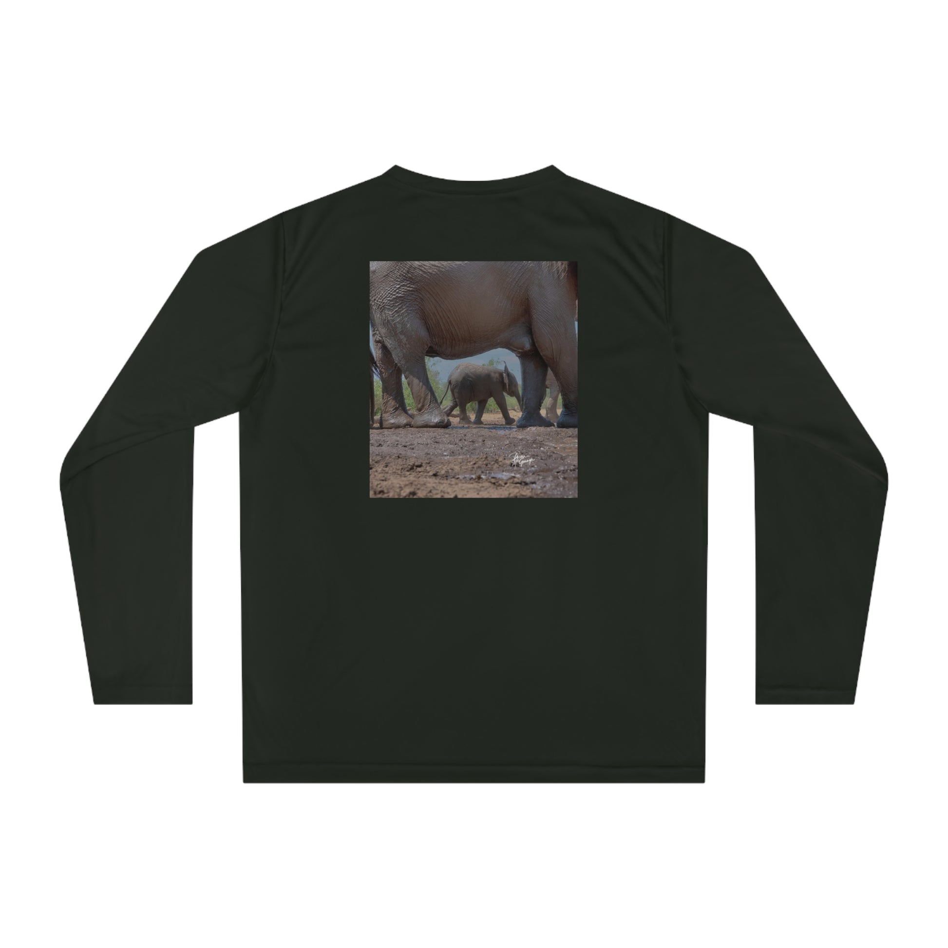Unisex Long Sleeve Performance Tee - "Elephant Baby Under Mom's Watchful Eye" by Enjoy Nature
