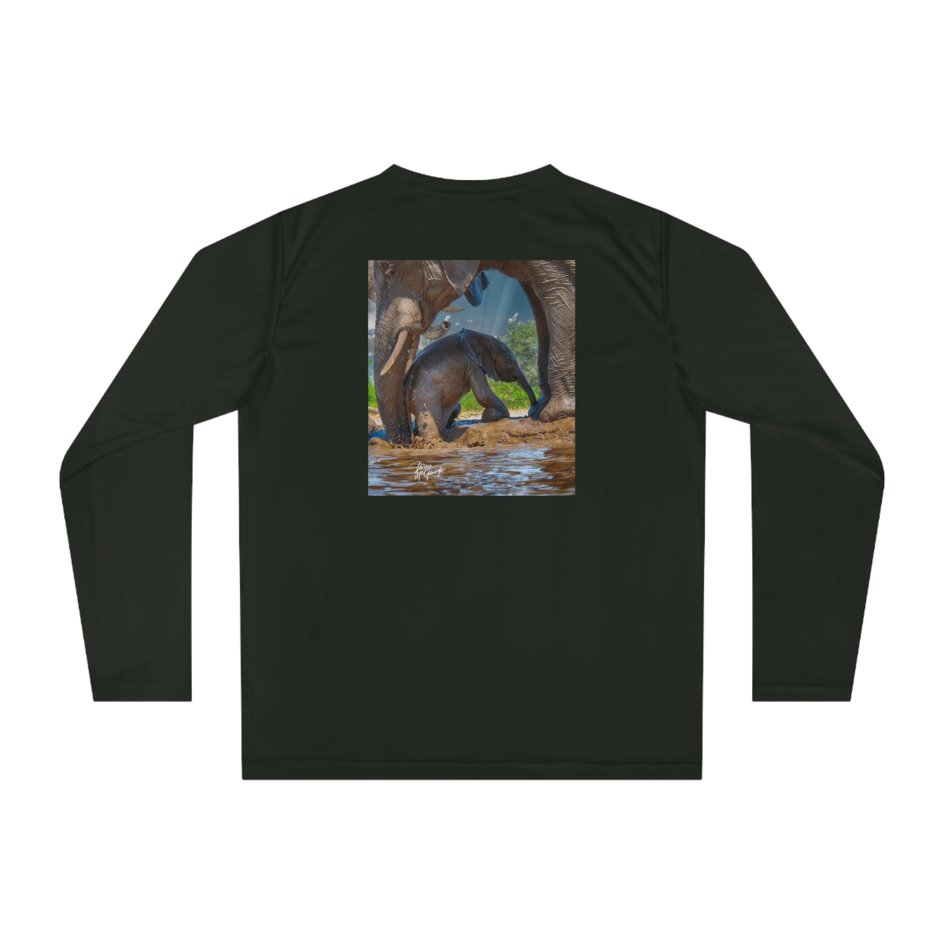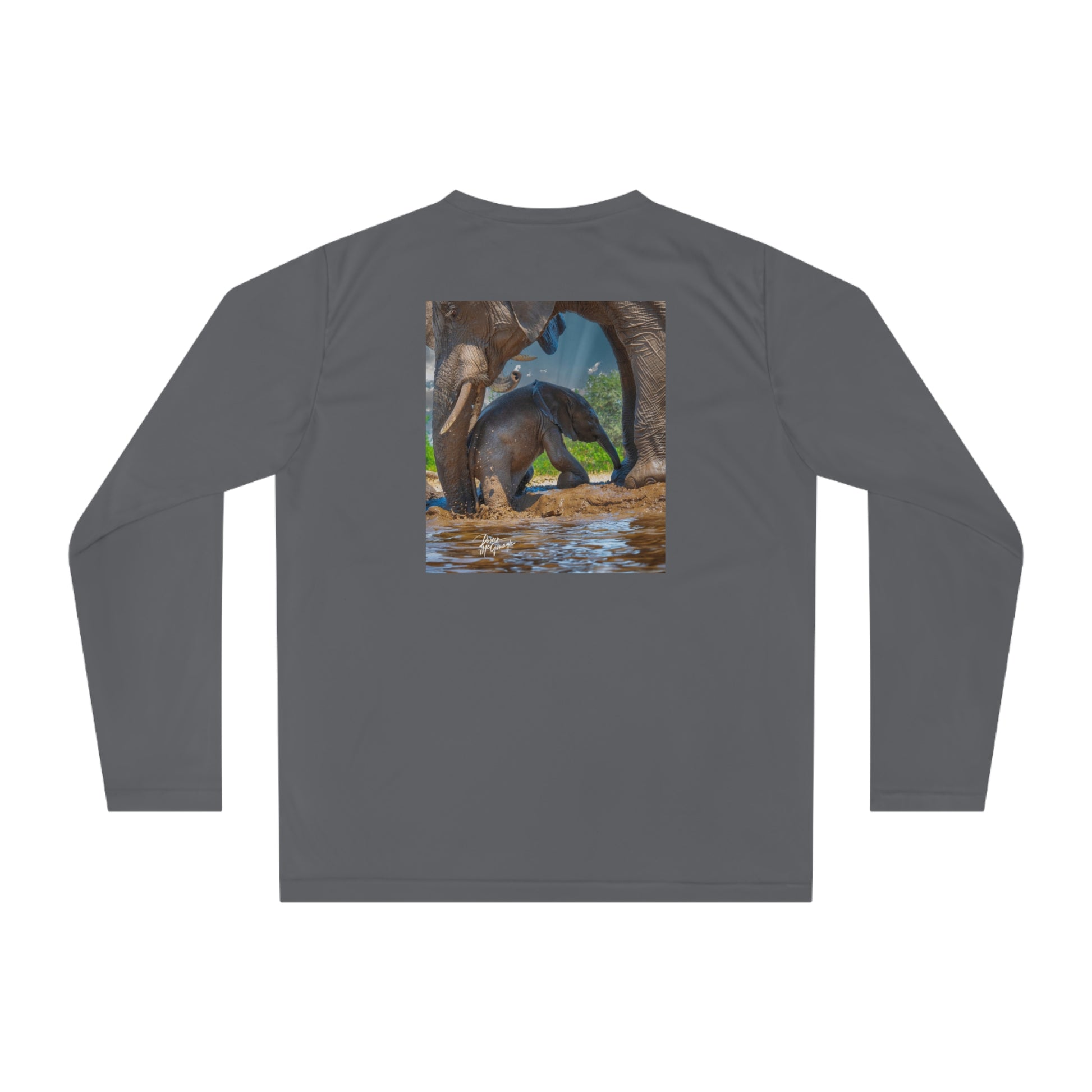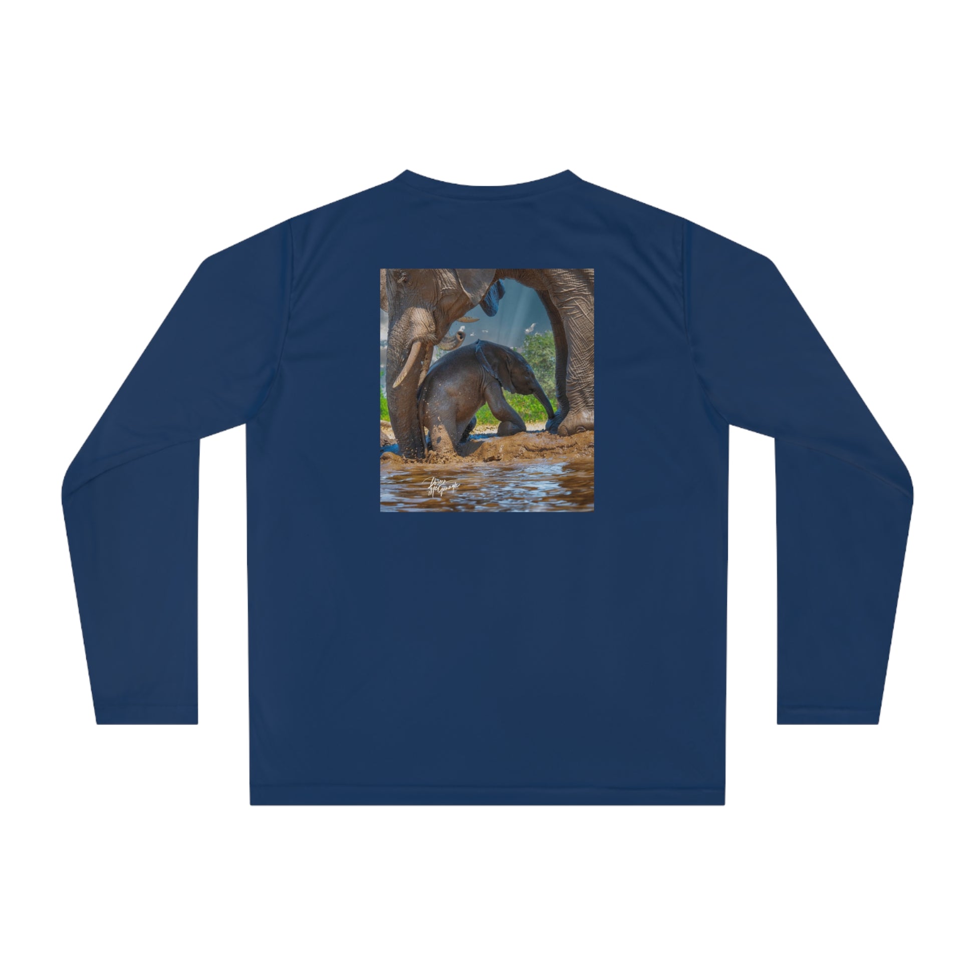 Unisex Long Sleeve Performance Tee - "Elephant Baby with Mom's Gentle Touch" by Enjoy Nature