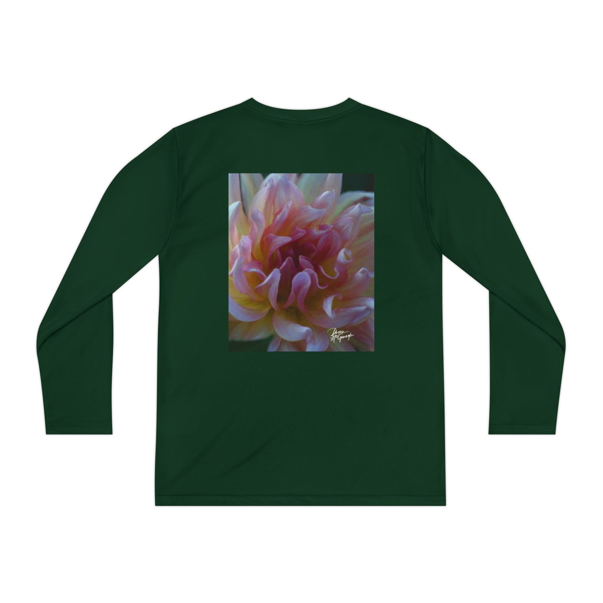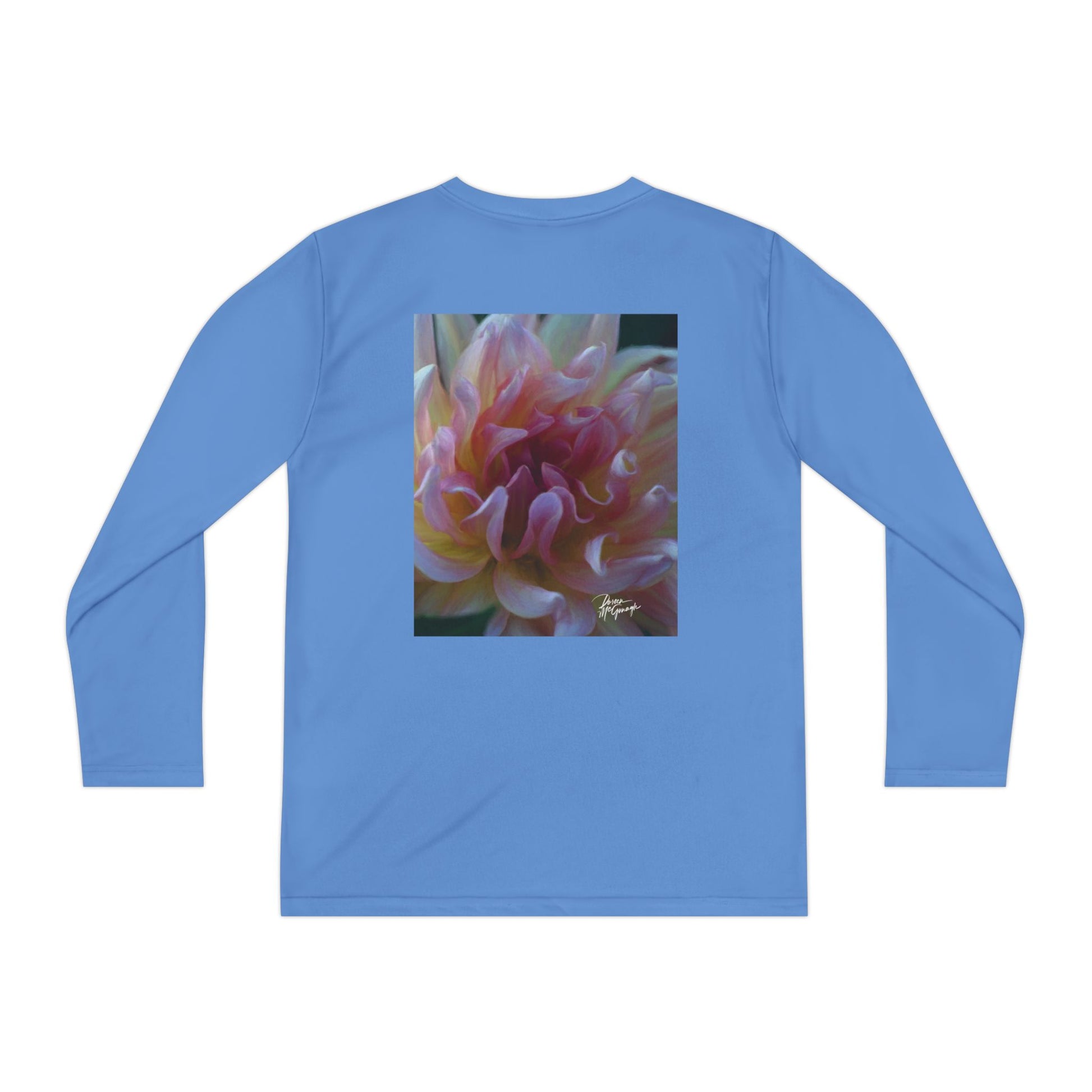 Youth Long Sleeve Active Tee – Veil of Cream and Blush Dahlia Design